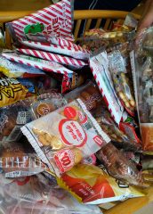 皆様、一生懸命、輪投げを行った後、下の写真にあります駄菓子を食べられました。